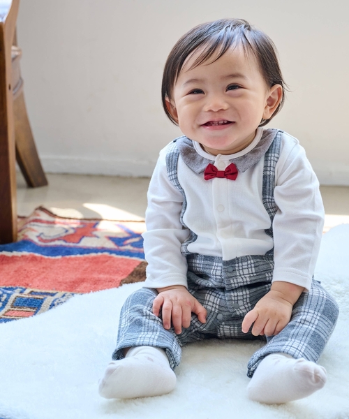 シーズンらしいチェック柄のサスペンダー風カバーオールです。さりげない恐竜のワンポイント刺しゅうが可愛らしいアクセントをプラス。チェック部分にカットソーのジャカード素材を使用し、伸縮性も抜群です。普段使いはもちろん、結婚式やパーティーなどのフォーマルシーンにも活躍します。【おすすめの着用時期は秋冬シーズン】【透け感】透けない【生地の厚さ】普通【伸縮性】あり【裏地】なし【ポケット】なし