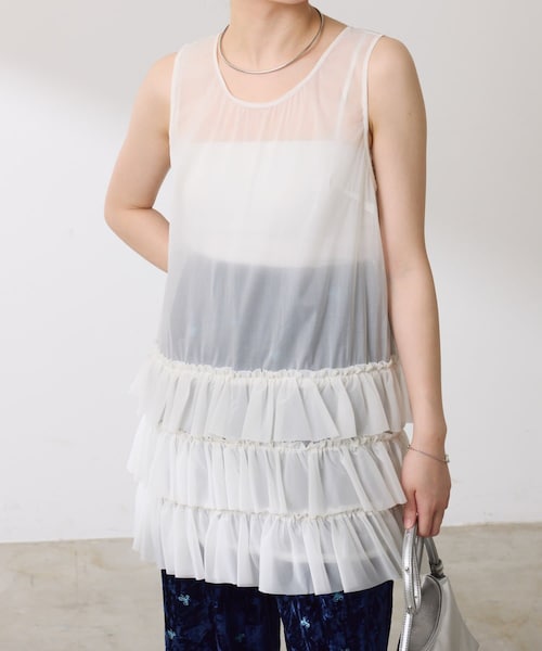 ワンランク上のレイヤースタイルが完成するティアードチュニック【POINT】・シアー感のある素材なので暑い時期からレイヤードを楽しめます。・シアーなので、ジャケットやニットの中に着た時にも程よく抜け感が出ます◎・ティアードのフリルが新鮮でワンランク上のレイヤードスタイルになります◎【おすすめコーディネート】秋口には、ニットやスウェット、ジャケットの中に合わせてフリルを出すとメリハリのあるコーデが完成します。【おすすめのスタイリングアイテム】・スウェットライクラウンドへムニット CLZ1052205A0001・リラックススリムパンツ CLS5052102A0001・クラッシュベロア刺繍パンツ CLZ1052202A0007【素材】ナイロン40%, ポリウレタン40%, ポリエステル20%透け感:あり裏地:なし伸縮性:ややあり光沢感:なし洗濯:手洗い可【気になる商品は「お気に入り」登録を】 ハートマークをクリックし、お好きなカラーを選んでお気に入りに登録すると入荷情報や残り1点の通知、完売カラーの再入荷、セール情報などを受け取ることができます。※撮影場所やお使いのモニター環境により若干お色味が異なる場合がございます。特にロケの撮影では明るく見える傾向にございます。詳細撮影画像で色味をお確かめくださいます様お願いいたします。※サンプルで撮影をしております。若干の仕様が変更になる場合がございますので予めご了承の上ご注文くださいますようお願いいたします。※サンプルでの採寸のためあくまで目安となります。予めご了承ください。≪返品・交換について≫・着用後、洗濯後の返品・交換は致しかねます。・商品到着後、着用前に商品状態のご確認をお願い致します。