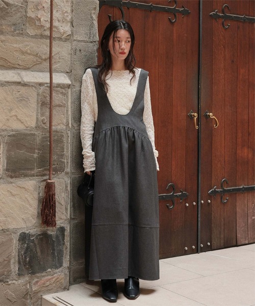 深めのUネックと立体感のあるコクーンシルエットが魅力の、大人の抜け感を演出するジャンパースカート。シンプルながらも洗練されたシルエットで、着るだけでこなれ感をプラスしてくれる一枚です。■Point・深めのUネックデザイン:首元に程よい抜け感を生み、インナーを選ばずレイヤードが楽しめます。・立体的なコクーンシルエット:ウエスト下からふんわりと丸みを帯びたフォルムが女性らしいやわらかさを演出。・シーズンレスに活躍:しっかりめの生地感で透けにくく、季節に合わせたインナー次第でオールシーズン対応可能。・着回し自在:シンプルながら存在感があり、デイリーからお出かけシーンまで幅広く活躍。■Coordination・春夏はTシャツやシアートップス、秋冬はタートルネックやニットをインナーにして季節感のあるスタイリングに。・足元はスニーカーやブーツなど、カジュアルにもきれいめにも合わせやすく、幅広いコーディネートに対応。・ジャケットやカーディガンを羽織って、レイヤードスタイルもバランスよく決まります。一枚で大人のこなれ感を叶える、シンプルかつ洗練されたジャンパースカートです。※当商品は機械による生産の過程上、どうしても"生地を織る際の糸の継ぎ目"や多少の"ほつれ"、他繊維の"混紡"、また、形やサイズや柄に多少の"誤差"が生じる場合がございます。※サイズは、実寸サイズを測っているため多少誤差がでる場合があります。製造工程の関係上、各採寸箇所実寸(平置き)より【約-3cm~+3cm】程度は誤差の許容範囲とさせて頂いておりますので、予めご了承くださいませ。※メーカーより密封状態で入庫し、検品時に再度袋詰めを行っておりますが、素材により染料等の臭いが強い場合がございます。※発送上の状態によって商品がシワになる場合がございます。※商品により色落ち・色移りがある場合がございますので、品質表示をご確認の上、お取り扱いにご注意くださいませ。【伸縮性】斜め方向に多少あり【透け感】なし