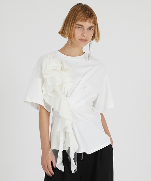 ー Style ー ローズのラッフルがアイキャッチなトップス。 ベースはTシャツで気負いなく着れるのがポイント。 ボディにもドレープを入れ表情豊かに仕上げている。 ウエストシェイプのシルエット。 さらっとパンツを合わせても様になる華やかなアイテム。 ー Fabric ー ボディにはコットン天竺を使用。 モチーフ部分はサテンとチュールを重ねて陰影を出している。 【PRANK PROJECT/プランクプロジェクト】 常識に縛られない洗練された大人の女性に向けて ”意外性” と ”品の良さ” をMIXさせた 上質なNEW MODE BRAND ・商品のお気に入り登録再入荷、残り1点などの通知を受け取ることが出来ます。 ・ブランドのお気に入り登録新商品や再入荷、ショップのおすすめトピックスなど、いち早くブランドのお得な情報を受け取ることができます。