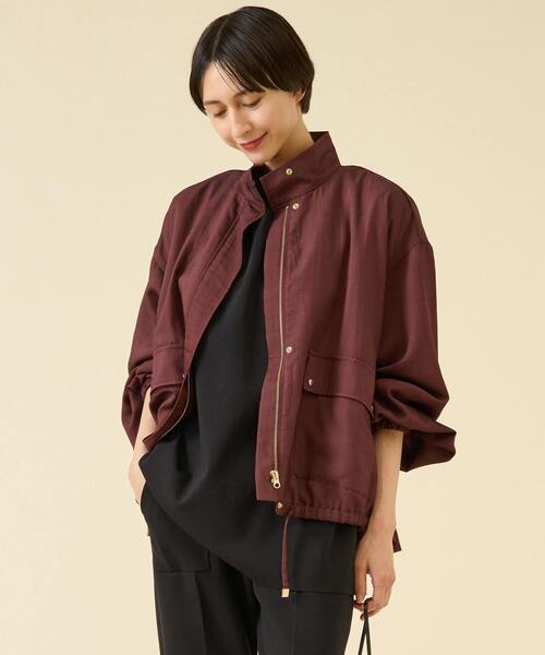 ≪デザインポイント≫ フロントは少しミリタリーテイストでマスキュリンに、BACKは裾にフリルデティールを施してフェミニンに仕上げたスタンドカラーブルゾン。アクセサリーのような繊細なドットボタンがポイントです。袖口にはゴムが入り、まくり上げることでこなれ感が出ます。 ≪素材・着心地≫ ヴィスコース混の素材でドレープ性と絶妙なハリ感の掛け合わせた感じがポイントです。程良い厚みで秋の立ち上がりにピッタリです。 ≪おすすめの着こなし≫ パンツスタイルからタイト、ボリュームSKまで幅広く似合いやすい丈感です。 透け感:なし 伸縮性:なし 光沢感:ややあり 裏地:なし 生地の厚さ:普通