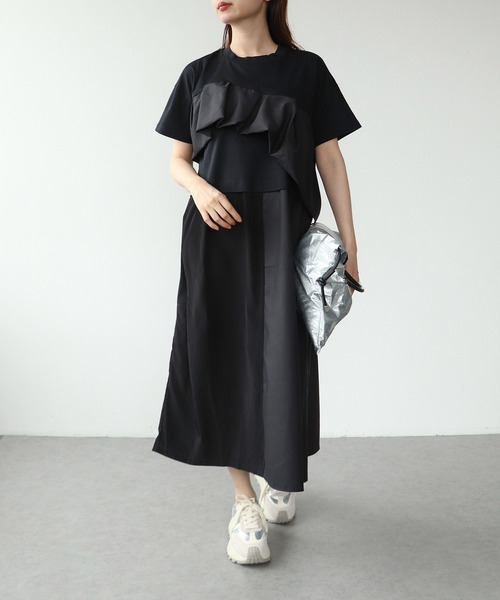 MARECHAL TERRE /ラッフルフリルジョイントワンピース胸元の大胆なフリルと素材の切替がオシャレ見え抜群の一枚着ワンピース。デザイン性が高いので一枚で主役級のアイテム。羽織などの組み合わせで秋にも活躍♪ベースは柔らかな綿素材で着心地も抜群! --------------------------------------透け感:なし裏地:なし伸縮性:ややありケア方法:手洗い可※お洗濯の際は洗濯表示を必ずご確認ください。--------------------------------------