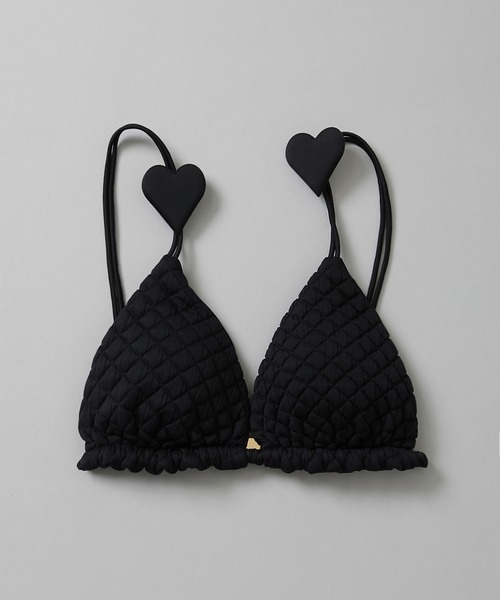 QUILT HEART TIE TOP キルトハートタイトップ ストレッチキルトとフラット素材のリバーシブルデザインです。 ハートパフは可動式で、自在に動かす事が可能。 極細パスタのようなダブルストラップ。 シュシュのようなアンダーストラップ。 トライアングルトップデザイン。 PAD内蔵タイプ。 PRODUCT DETAILS ● 速乾機能・UPF50+ ・ ストレッチ機能付き ● サイズ:S・M・L ● カラー:ホワイト・ブラック・イエロー PRODUCT CODE 24-1007 【PRODUCT SIZE】 ブラ着丈(Bra length) S15cm・M 16cm・L17cm アンダー(Bra under)S50cm・M54cm・L58cm 肩紐(Shoulder strap length)S33.5cm・M34cm・L34.5cm LOOK AFTER ME ぬるま湯手洗いを推奨しております。 ネオンカラーのデザインは光に弱く日光に当たると白っぽく色あせることがあります。