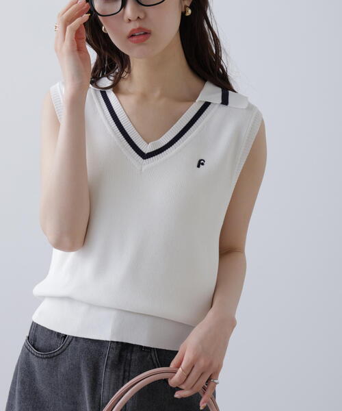 〔fabric&design〕ドライタッチでありながら硬くなく、肌なじみの良い盛夏に適した糸を使用。片畔編みで、軽やかにご着用いただけます。 首詰まりせずスッキリとしたVネックで、配色ラインを強調したスポーティーなデザイン。胸元の刺繍ロゴもポイントです。〔styling〕 プリーツスカートやミニスカートと合わせて、トレンドのテニスコアスタイルに。他デニムパンツ合わせもおススメです。 商品特性 ■透け感:なし ■生地の厚さ:普通 ■裏地:なし ■伸縮性:あり ■光沢:なし ■シルエット:スタンダード --------------------------------------------------- ◆商品のお気に入り登録◆ お気に入りアイテムの値下げ・再入荷・在庫1点などの通知を受け取ることができます。 ◆ブランドのお気に入り登録◆ 新商品や再入荷、セール、クーポン配布などお得な情報を受け取ることができます。 ---------------------------------------------------