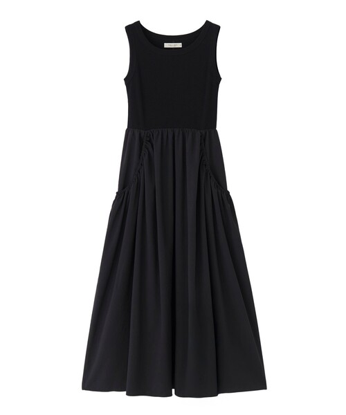 ■デザインカットソーとナイロン生地がドッキングされたワンピース。細見えするちょうどいい高さでの切替と、ウエストの細さを強調するようにあえて大きめに作っているポケットがPOINT。肩の部分には、インナーがずれないように留めることのできるテープ付きで、下着が見える心配が無く安心。■素材・透け感 なし・裏地 なし・伸縮性トップス あり上身頃部分は、体のラインを拾いすぎないリブ素材。しっかりとした肉感がありながら、シャープな表面感で肌離れの良いタッチ。スカート部分は、国内工場で高密度のタフタにヴィンテージ加工を施し、ハリ感を残しながらソフトで軽い風合いに。UVカット、速乾性、接触冷感の機能付きで、とにかく涼しく過ごしたい夏のワンピに最適な生地。
