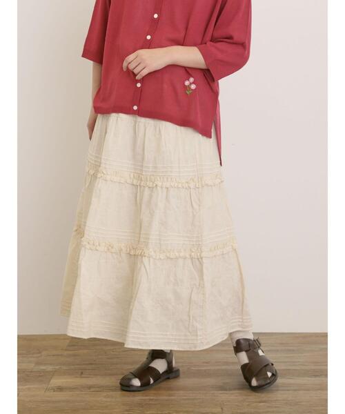 フリルをあしらったティアードデザインが可愛らしいスカート。 ふんわりとしたボリューム感のあるシルエットで、スタイリングも華やかな印象に。 ウエスト部分はゴム仕様になっていて着心地が良いのも嬉しいポイントです。 シンプルながらも愛らしい着こなしに決まるアイテム。 ※商品画像は、撮影環境やお客様のご利用のPC・スマートフォンのモニター環境などにより実物と色味に差異がある場合がございます。 【その他採寸】 F ウエスト:[ゴム仕様]66cm