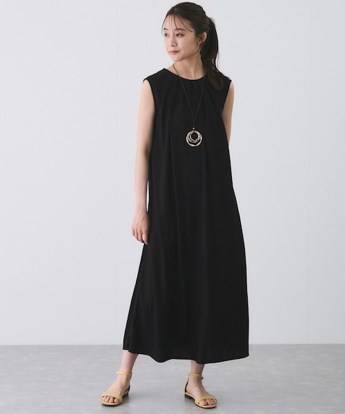 【デザイン・シルエット】 人気の接触冷感素材を使用した、鹿の子編みのノースリーブワンピース。 さらっとした肌ざわりと軽やかな着心地で、暑い季節も快適に過ごせます。 シンプルな無地のデザインながらもフロントに施されたタックが華やかさを演出。 バックスタイルはさりげない肌見せで抜け感をプラスします。 ハンドウォッシュ可能でイージーケアも兼ね備え、デイリーに活躍する一着です。 【素材感】 接触冷感機能付きの鹿の子素材 【カラー】 01クロ 36カーキ 46ブルー 【スタイリングポイント】 一枚でこなれ感のあるコーデが完成します。 気分やシーンに合わせてアクセサリーや小物をプラスすると、華やかなコーデに仕上がります。 さらりとした素材感なのでカーディガンやショートブルゾンなど、ライトアウターとの相性も抜群◎ 旅行などにもおすすめです。 裏地:なし 光沢感:なし 透け感:なし ポケット:なし 伸縮性:なし 生地の厚さ:普通 ボタン:あり その他仕様:なし 季節:春夏秋 ※撮影時の光、お使いのモニター環境によって色の見え方が違う場合がございます。予めご了承ください。 モデル身長:167cm 着用サイズ:M