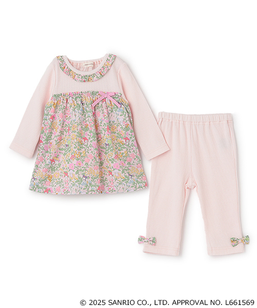 リバティファブリックスの「Melody’s Party(メロディーズ・パーティ)」を使用したセットアップです。マイメロディやクロミ達が草花で楽しんでいる姿を描きました。さりげないリボンデザインもかわいいポイント。バックネックはお着替えしやすいゴム仕様です。内側にお名前を記入できるタグがついています。【透け感】透けない【生地の厚さ】普通【伸縮性】あり【裏地】なし【ポケット】なし【アジャスター】なし