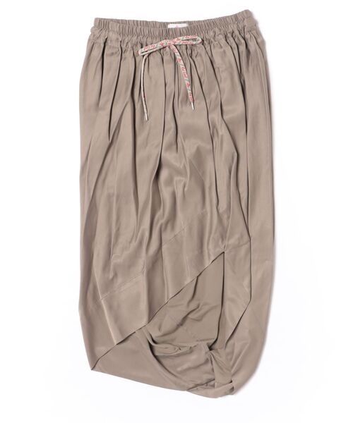 サテンの控えめな光沢が大人っぽく、生地を揉みこんだふくらみのある表情でカジュアルさもプラスされたリラックス感のある素材。スクエアのパーツを組み合わせて立体的なフォルムを創り出した、アシンメトリーなヘムラインがポイントのドレープスカート。ウエストはゴム仕様で、程よいボリュームがあり、ストレスフリーな履き心地です。