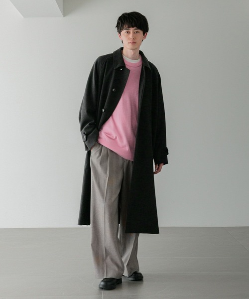 ■素材ニードルパンチという特殊起毛加工で、ウールのような表情や暖かみを表現したウールライクファブリックです。ジャージ組織で伸縮性もあり快適に着こなせます。■デザイン一枚袖のラグランスリーブやクラシカルなバックヨークデザインを採用したトラディショナルなステンカラーコート。襟を立てた時に見える衿裏の別布コーデュロイや、深いサイドスリット等、細部にもこだわりのディティールを加えた一点。
