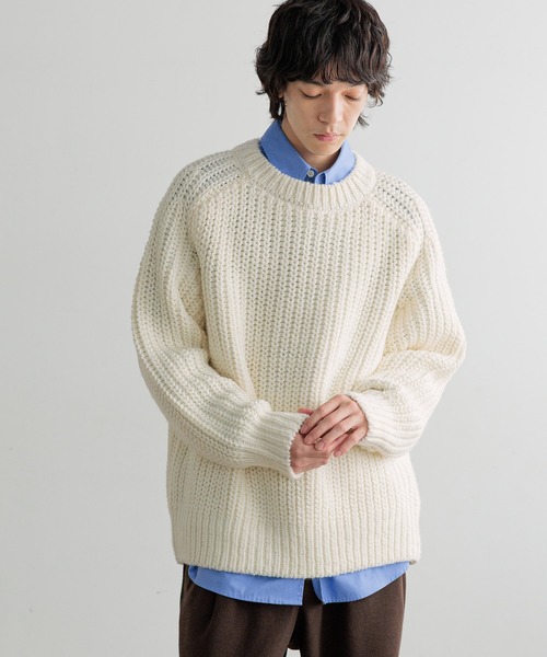 ■素材通常の糸よりわたに近い状態の太い糸を使用する事で、ざっくりとした手編みの雰囲気を表現したニットになっています。■デザインハンドニットのようなざっくりした風合いが魅力のニットです。ラグランスリーブの一種である、サドルショルダースリーブになので肩のラインが出にくく、体に馴染むシルエットです。しっかりしたボリューム感でコーディネートの主役になるアイテムです。