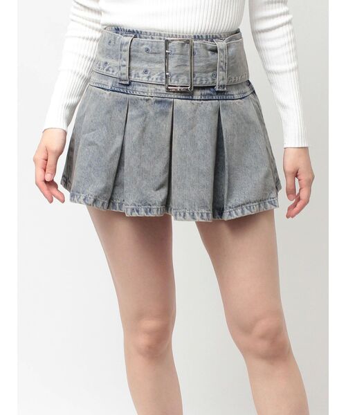 ■デザイン 取り外せる共生地のワイドベルト×プリーツディテールで全体にボリュームをプラスしたデザイン。 グレー加工を入れたアイスカラーと、落ち着いたインディゴカラー、ミックスのベージュベースカモフラ柄の3色展開で、 ストリートにも甘辛にも、幅広くマッチする万能デニムアイテムです。 左脇ファスナー開きにし、着脱もしやすい仕様。 ミニ丈でも、インナーショーツ付きなのが嬉しい1着。 ■スタイリング タイトショート丈のトップス+厚底シューズ合わせで脚長効果抜群スタイリングが◎ ニットアイテムと合わせても相性が良いです。 ■商品のお気に入り登録 再入荷通知やラスト1点、お得なプライスダウンの情報も受け取ることができます。 ぜひご登録ください◎ ・・・・・・・・・・・・・・・・・・・・・・ ※着用画像はフラッシュの加減で実際の製品と色味等が異なる場合がございますので、生地のズームアップ画像をご確認ください。 ※ご利用の端末画面の設定により実際の商品と色味が異なる場合がございます。