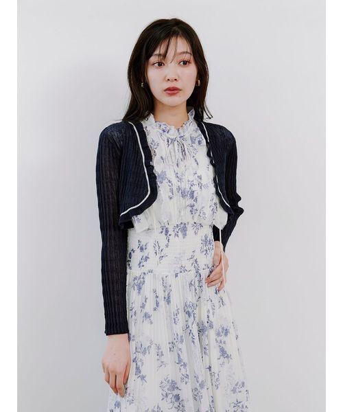 【フリルディテールと配色で華やかに仕上げた人気のボレロシアーニットカーディガン】【Design/Styling】軽やかなシアーなニット素材の柄編みボレロカーデが今季も登場。表情豊かな変形柄編みと、襟元から裾まで程よく入れたフリルディテールが女性らしさを引き出します。今年は配色を取り入れて、より華やかな仕上がりに。ふんわり柔らかな印象のプリントプリーツウエストシャーリングワンピ(SWFO254139)や、シアープリーツウエストシャーリングワンピ(SWFO254287)とのコーデもおすすめです。【Fabric】ワンカラーのアイボリー、柔らかなブラウンの配色を利かせたピンク、ホワイトの配色を利かせたネイビーの3色展開です。シアーニット生地を使用。透け感;ややあり裏地;なし伸縮性;あり光沢感;ややあり生地の厚さ;やや薄手【おすすめ骨格タイプ】■骨格ウェーブ■骨格ナチュラル※照明の関係により、実際よりも色味が違って見える場合があります。またパソコン・スマートフォンなどの環境により、若干製品と画像のカラーが異なる場合もございます。予めご了承ください。商品の色味は、商品単品画像をご参照下さい。 ※商品画像はサンプルのため、色味やサイズ等の仕様に変更がある場合がございますので、予めご了承ください。
