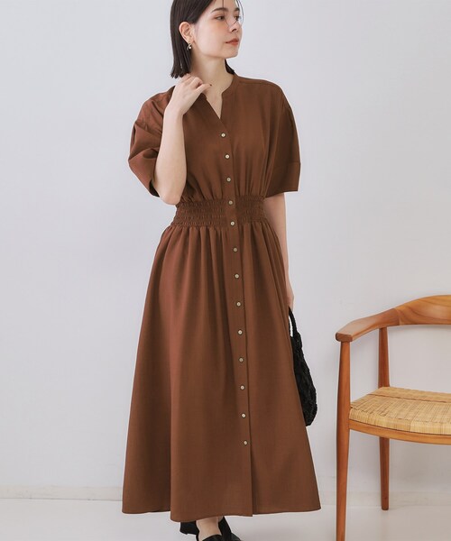 さらりとした素材感で涼やかに着られる、フィット&フレアシルエットのシャツワンピース【デザイン】・ウエストにシャーリングデザインを施したフィット&フレアシルエットのワンピース・ボタンの前開き仕様で、着脱も簡単です・衿部分がスキッパーデザインになっており、きちんと感がありつつも涼しげに着られるワンピース・シンプルなシャツワンピースにトレンド感をプラスしてくれる、ランタンスリーブデザインもポイントです【素材】・さらりとした素材感が夏に嬉しい、ポリエステル100%の素材を使用・麻調のメランジ感がポイント・マシンウォッシャブルでお手入れも簡単です【機能】・ボタン前開き・ポケット横×2・ウエスト総ゴム・裏地なし※こちらの商品はやや透け感があるため、インナーの着用をおすすめします。※照明の関係により、実際よりも色味が違って見える場合があります。また、パソコン・スマートフォンなどの環境により、若干製品と画像のカラーが異なる場合もございます。モデル情報:身長163cm B82 W62 H91 着用サイズ:38(M)店舗へのお問い合わせ商品番号:637-53016●製品寸法:36(S):着丈126cm B90cm 袖丈24cm 肩幅50cm W58~68cm H104cm38(M):着丈127cm B93cm 袖丈24cm 肩幅51cm W60~70cm H105cm40(L):着丈128cm B96cm 袖丈25cm 肩幅52cm W62~72cm H106cm42(LL):着丈129cm B100cm 袖丈25cm 肩幅53cm W64~74cm H108cm備考: