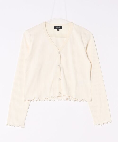 スムースリブジャージのカーディガン.*ストレート、ショートカット.*シルバーで縁取られたボタン4つ留め.*袖口、裾にスカラップ処理.
