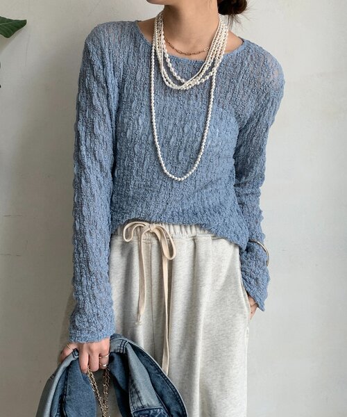 ■2025 AUTUMN & WINTER ITEM■ヘルシーな肌見せを叶える繊細な透け感!甘すぎないレースの柄がポイントのリンクルシャーリング素材。肌触りも良く着心地も快適です!スタイリングに軽やかさと抜け感をプラスしてくれます。一枚着だけではなく、ジャケットやシャツのインナーとしても着用していただけます!- POINT -・上品な透け感・レイヤードスタイルが楽しめる・華やかな存在感--------------------------------洗濯:手洗い可能透け感: あり裏地: なし伸縮性: ややあり光沢感: なし--------------------------------【 ♡ をクリックでお得な情報をお知らせいたします 】〈 商品のお気に入り登録 〉 お気に入りアイテムのお値下げ・再入荷・在庫ラスト1点など通知を受けることができます。〈 ブランドのお気に入り登録 〉DOUDOUの新商品や再入荷、セール、クーポン配布などお得な情報を受けることができます。--------------------------------------※ 生産の都合上、お届け時期が前後する場合がございます。※ 掲載画像の商品の色味は、 撮影場所や光の当たり具合などにより色味が異なって見える場合がございます。 また、お客様のお使いのPC・スマートフォン等のモニター環境などにより色味が異なって見える場合がございます。予めご了承の上ご注文ください。 ※ 着用、お取り扱いの際は、商品についている品質表示とアテンションタグを必ずご確認下さい。