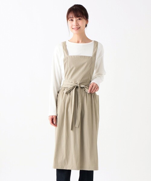 ワンピースのような見た目で、毎日の気分を華やかに盛り上げるエプロン。 丈を長めに設定しており、ファッション感覚で使えるのが魅力のアイテムです。フロント部分にギャザーを施し、ふんわりと上品なデザインに仕上げました。フロントの両サイドにはポケット付きで、家事に必要な小物や髪留めなどを入れたいときに便利な仕様です。ウエストの前でリボンを結ぶタイプなので、フィット感をお好みに調整ができるのもうれしいところ。ご自身用にはもちろんのこと、これから新生活を迎えるご友人やご家族へのギフトにもいかがでしょうか。 モデル身長/165cm 製造時期により、ベージュのお色味が多少異なる場合がございます。あらかじめご了承ください。 身丈91cm/身幅94cm