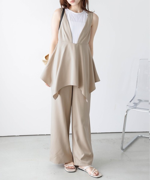 着るだけでこなれ感を叶える 大人モードなサロペット ドレープ感のあるペプラムデザインが印象的なアイテム。 遊び心のあるデザインで、大人の余裕を感じさせるデザイン。 シンプルにTシャツと合わせるだけで、洗練されたモードな雰囲気を叶え、 セットアップ見えする大人のサロペットです。 Point 01 上品でモードな印象に フレアトップスとワイドパンツが一体化したデザインで、 体型カバーも叶えつつ、華やかな印象に。深めのVネックや アシンメトリーな裾が、動きに合わせて美しく揺れ、 女性らしさを引き立てるアイテムです。 Point 02 即コーデの完成◎ セットアップのようにきちんと感がありながら、1枚でコーデが 完成する優秀サロペット◎インナー次第でカジュアルにもキレイめにも 着回せ、日常からオケージョンまでシーンを問わず活躍してくれる1着です。 ■Fabric ほど良いハリ感がありながらも、さらりとした落ち感のある生地感 --------------------- 透け感:ベージュのみ若干あり 裏地:なし 厚さ:普通 伸縮性:なし ---------------------" ▼《お気に入り登録》でお得な情報がいっぱい▼ ・「商品のお気に入り登録」で再入荷通知や、ラストの通知、セール通知も受け取ることができます。 ・「ブランドのお気に入り登録」で新商品や再入荷など、お得な情報を受け取ることができます!