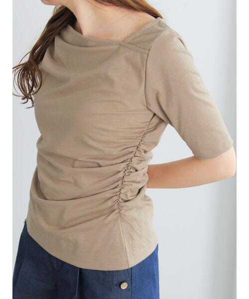 アシンメトリーなネックとドレープデザインが、モードな雰囲気を演出するトップス。すっきりとしたハーフスリーブで気になる二の腕ラインもさりげなくカバー。シンプルながらもスタイリングに個性をプラスし、こなれ感のある着こなしに決まるアイテムです。※商品画像は、撮影環境やお客様のご利用のPC・スマートフォンのモニター環境などにより実物と色味に差異がある場合がございます。