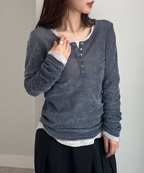 \大好評につきシーズンライクな新色を追加!/新色『ライトグリーン』・『ピンク』が登場!25AW新作!お気に入り34,000人突破!!ZOZOTOWN人気アイテムランキング1位獲得!【レディース/Tシャツ・カットソー(長袖)】 2025年9月18日時点昨年好評のシアーベロアトップスから素材を変えて新作が登場!首元のスナップボタンがワンポイントになったシアーベロアヘンリーネックロンT■point・程よい透け感のある、柔らかな雰囲気のベロアトップス・首元のスナップボタンと袖口のシャーリングがポイント・一枚着はもちろん、冬はインナー使いにも。ロングシーズン着回せるアイテム・コンパクトなサイズ感で華奢見えも◎・ベーシックな長袖Tシャツに飽きた方にもおススメ■detailフロッキー加工のような表情がポイントのベロアトップス。首元のスナップボタンと袖口のギャザーがアクセントのデザイン。軽い着心地でロングシーズン活躍してくれるアイテム。首元が広くてデコルテがきれいに見える!大人女子にもぴったりなヘルシーな肌見せが叶います。■fabric透け感のある柔らかいシアーベロア素材を使用。フロッキー加工のように見えて、ヴィンテージ感が漂う風合いです。-------------------透け感:ややあり厚さ:薄手伸縮性:あり裏地:なしポケット:なし洗濯方法:洗濯機OK-------------------■coordinateコンパクトなサイズ感なので、スラックスやフレアデニムなどと合わせるとすっきりとした大人カジュアルな印象に。ワイドパンツやボリュームのあるスカートなどと合わせたルーズな着こなしもトレンドライクでおすすめです。旬なビスチェやサロペットなどのインナー使いにもぴったり。モード・ストリートからトレンドのバレエコアにも取り入れられる着回し力抜群のアイテムです。※ご覧のモニター環境により、画像の色味と多少異なる場合がございます。★商品のお気に入り登録がおすすめ★完売カラーの再入荷通知や、ラスト1点の通知、セールの際の通知を受ける事ができます。ブランドのお気に入り登録もご一緒にお願いします。solleim”仕事でもプライベートでも自分なりのスタイルを大切したい”そんな自立した女性に向けたファッション。シンプルでありながらもハンサムでエッジの効いたアイテムを、どこか女性らしい雰囲気のスタイリングでブランドの最新情報はinstagram【@solleim_official】でご確認いただけます。※他のキャンペーンにより、期間中に価格が変動する場合があります。※セールは予告なく終了させていただく場合もあります。