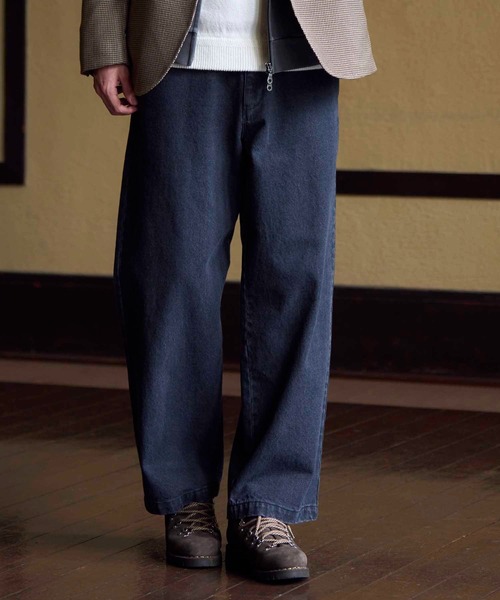 ラフに穿いて、サマになる。セットアップでも単品でも映えるワイドデニム。【特徴】・程よい厚みと柔らかさを持つコットンデニム素材を使用・脚まわりにゆとりを持たせたワイドレッグシルエットで、トレンド感も抜群・フロントにはワークテイストな斜めポケット、バックにはパッチポケットを配置しアクセントに・ジッパーフライ&ボタン留め仕様で、デイリー使いに嬉しい着脱のしやすさ・カラーはブラック・ブルーの2色展開。色違いで揃えても◎・同素材のカバーオール(品番:M0854FJM004)とのセットアップスタイルもおすすめ【コーディネート提案】・同素材のカバーオールと合わせて、ワーク×モダンなセットアップコーデに・白TやロゴTを合わせるだけで、ラフすぎずこなれた休日スタイルが完成・足元はボリュームスニーカーやレザーサンダルで、抜け感とバランスを調整・トップスはタックインでもアウトでもOK。ワイドシルエットが活きるスタイリングに・ユニセックスで使えるシルエットなので、シェアやペアスタイルにも◎