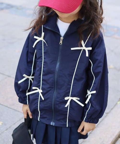 さりげなくあしらわれたリボンが目を引く、ガーリーなデザインのキッズブルゾン。軽やかな素材感で季節の変わり目にもぴったり。袖や裾にはゴムが入っており、冷たい風をしっかりガード。カラーはアイボリーとネイビーの2色展開で、どちらも着回しやすい万能カラーです。フロントはジッパー仕様で、脱ぎ着もラクラク♪【おすすめコーデ】・ワンピースの上に羽織って、お出かけコーデに・パンツやレギンスと合わせて、カジュアルなデイリースタイルに【おすすめシーン】通園・通学、公園遊び、お出かけ、春秋のライトアウターに最適!