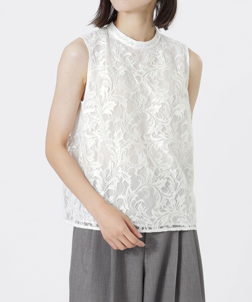 繊細レースで魅せる、ノースリーブブラウス 【素材】 光沢感のある繊細なレースにシフォンを重ねることで、肌を上品に透かしながら、ほのかにセンシュアルで奥行きのある表情を演出。 大人に似合う、華やかさと落ち着きを兼ね備えた素材感です。 【シルエット/デザイン】 計算されたカッティングで、ほどよくフィットしながらも快適な着心地に。 ボトルネックとノースリーブがデコルテから肩のラインを美しく引き立て、上品な肌見せを叶えます。 甘さを抑えたレース使いで、大人の装いにぴったりな一枚です。 【スタイリング/その他】 ハイウエストのボトムを合わせれば、ミニマルながらも印象的なスタイルが完成します。 きれいめパンツで都会的に、ロングスカートで女性らしくまとめるのも◎。 ジャケットを羽織れば、季節の変わり目にも活躍します。 【お手入れ方法】 こちらの商品は、手洗いでのお洗濯が可能です。 ━━━━━━━━━━━━━━━━━━━━━━━━━━ お買い物をお楽しみ頂くために <商品のお気に入り登録> 完売カラーの再入荷通知など、お得な情報をお届けします。 <注意事項> この商品はサンプルでの撮影を行っています。 実際の商品とイメージが異なる場合がございます。 撮影環境により、光の当たり具合で色味が違って見える場合があります。あらかじめご了承下さい。