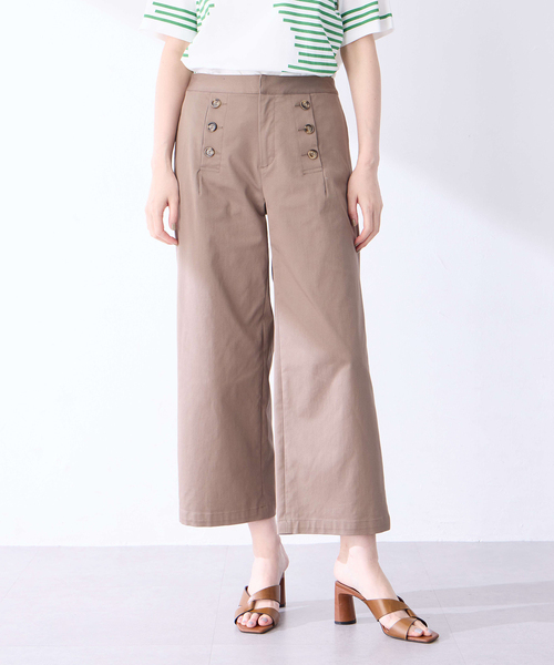 《フロントのボタンデザインがポイントのマリンパンツ》ゆとりのあるシルエットになっているため、気になる体型をカバーしてくれます。コットンベースの生地がさらりとした肌触りを演出。シンプルなトップスをタックインした着こなしがおすすめです。コーデに取り入れるだけで、シーズンムードを高めてくれるアイテム。【デザインポイント】・ウエストのボタンがコーディネートのお洒落なアクセントになります。・適度なワイドシルエットで脚のラインを美しく整えてくれます。・きれいめカジュアルな雰囲気で、ブラウスを合わせればオフィスシーンにもフィット。・ボーダーアイテムと合わせてマリンスタイルを楽しむのも◎【機能】・伸縮性をもたせ動きやすいパンツに仕上げました。・暑い夏を快適に過ごせる接触冷感素材。----------商品情報----------[着用目安]春・夏・秋[裏地]なし[透け感]なし[伸縮性]あり----------------------------【サイズバリエーション】・64cm(9号/Mサイズ相当)・67cm(11号/Lサイズ相当)【ブランド紹介】French Casualーフェミニンに生きる女性のためのリアルクローズがPetit Honfleur(プチオンフルール)。カジュアルをベースに、ほどよくトレンドを落とし込んだアイテムは大人可愛く、“映え”間違いなし!着こなしやコーディネートで旬のスタイリングを提案します。【お買い物をお得にもっと楽しんで頂くために】▼商品のお気に入り登録▼完売カラーの再入荷通知や、ラスト1点の通知、プライスダウンしたセール通知も受け取ることができます。▼ブランドのお気に入り登録▼新作や再入荷等、いち早くブランドのお得な情報を受け取ることができます!