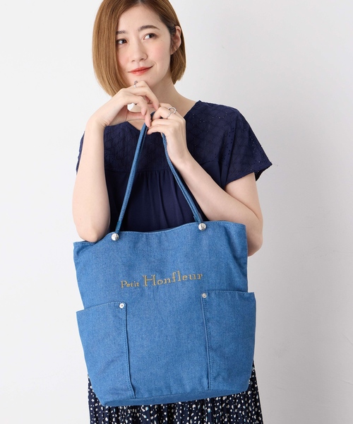 《ブランドロゴ刺しゅうがアクセントになるデニムバッグ》中身をたっぷりと収納できるサイズ感になっており、使い勝手の良さが魅力。サイドポケットや内側のファスナーポケットで小物類の整理も可能です。開口部には中身見えを防ぐファスナーが付いているので、安心して持ち運ぶことができます。カジュアルはもちろん、きれいめなコーディネートのアクセント使いにも活躍するアイテムです。【デザインポイント】・どんな柄やカラーの洋服とも合わせやすいデニムバッグです。・大きめのサイドポケットで小物をさっと出し入れできます。・肩掛けしやすい持ち手の長さにこだわりました。【機能】・幅41cm×高さ35cmでA4(横21cm×縦29.7cm)の書類やファイルをすっぽり収納していただけます。・ファスナー付きで中身を見せず、貴重品を入れても安心です。・鍵や定期入れを収納しやすい内側ファスナーポケット付き。----------商品情報----------[着用目安]春・夏・秋・冬・通年----------------------------【サイズバリエーション】・フリーサイズ【ブランド紹介】French Casualーフェミニンに生きる女性のためのリアルクローズがPetit Honfleur(プチオンフルール)。カジュアルをベースに、ほどよくトレンドを落とし込んだアイテムは大人可愛く、“映え”間違いなし!着こなしやコーディネートで旬のスタイリングを提案します。【お買い物をお得にもっと楽しんで頂くために】▼商品のお気に入り登録▼完売カラーの再入荷通知や、ラスト1点の通知、プライスダウンしたセール通知も受け取ることができます。▼ブランドのお気に入り登録▼新作や再入荷等、いち早くブランドのお得な情報を受け取ることができます!