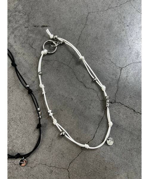 トレンドの紐ネックレス■デザイン夏のさらっとしたコーデにプラスするだけで今季らしい着こなしになるのでおすすめです。紐は細めなものを二連にしているので、ハードな印象になりすぎず付けやすいのがポイント。紐には大小様々なメタルビーズを通しアクセントにしています。ホワイトカラーは夏にっぴたりの爽やかな印象になります。※着用画像はフラッシュの加減で実際の製品と色味等が異なる場合がございますので、生地のズームアップ画像をご確認ください。※ご利用の端末画面の設定により実際の商品と色味が異なる場合がございます。
