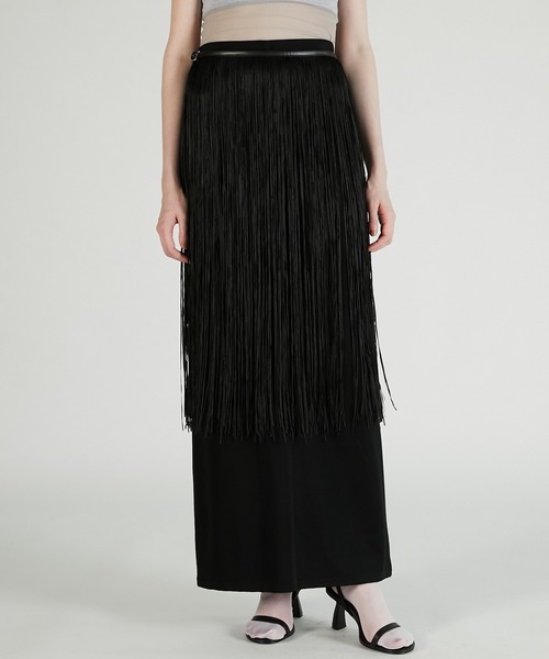 ー Style ー大胆なフリンジ使いが目を惹くロングスカート。シンプルなコーディネートも華やかに仕上げてくれるアイテム。滑らかで落ち感のある素材が美しいシルエットを演出。ウエストは程よくフィット感があり腰まわりをすっきりと見せてくれる。Tシャツやスウェットとのカジュアルミックスや、ジャケットを羽織ったモードスタイルまで、幅広い着こなしが楽しめる一枚。フリンジ部分はベルトになっており、ベルトの内側にあるタブにとめればフリンジネックレスとしても着用可能。ー Fabric ーストレッチ性とキックバック性に優れた着心地抜群のカットソー素材を使用。【PRANK PROJECT/プランクプロジェクト】常識に縛られない洗練された大人の女性に向けて”意外性” と ”品の良さ” をMIXさせた上質なNEW MODE BRAND・商品のお気に入り登録再入荷、残り1点などの通知を受け取ることが出来ます。・ブランドのお気に入り登録新商品や再入荷、ショップのおすすめトピックスなど、いち早くブランドのお得な情報を受け取ることができます。