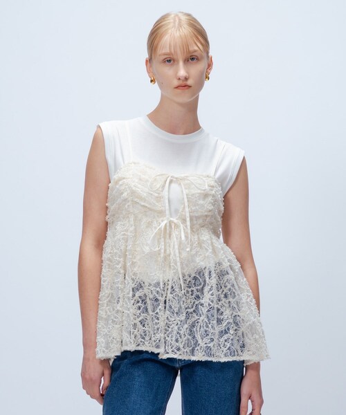【デザイン】 ・繊細で華やかなレースを贅沢に使用した、コーディネートに華やかさをプラスするレースキャミソール。 ・シンプルなカットソーに重ねるだけで今っぽいレイヤードスタイルが完成。 ・前後2WAYで楽しめるデザインで、スタイリングの幅が広がります。 ・胸元のリボンディテールとバックシャーリングが女性らしく華やかな印象を演出。 ・お好みの長さに調整可能な華奢な肩紐で、バランスよく着用できます。 【素材】 ・柔らかくしなやかなレース素材を使用。 【着こなしポイント】 ・Tシャツやタンクトップの上に重ねて、大人カジュアルなレイヤードスタイルに。 ・ブラウスとのレイヤードもおすすめで、今年らしいスタイリングが楽しめます。 ※着用しているインナーは本商品ではございません。 モデル身長:176cm ーーーーーーーーーーーーーーーーーー 気になるアイテムはお気に入り登録がおすすめ! お気に入り登録で、再入荷通知やお値下げ情報をお知らせ。 お得な情報をいち早くお届けいたします! アイテムページにある、ハートマークをクリックして追加できます。 ーーーーーーーーーーーーーーーーーー ※照明の関係により、実際よりも色味が違って見える場合があります。また、パソコン・スマートフォンなどの環境により、若干製品と画像のカラーが異なる場合もございます。 店舗へのお問い合わせ商品番号:R91-83007 ●製品寸法: 02(M):着丈46cm B87cm 備考: