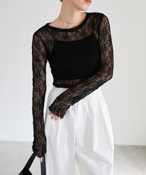 -point- & -styling-シンプルなデザインに繊細なレースをプラスしたシアートップス。レース生地は伸縮性がありソフトタッチな肌触りでストレスフリーな着心地。程よくタイトなサイジングと長めのお袖がレディライクな印象に。袖元のメロー仕様が女性らしいフェミニンな雰囲気を叶え、普段のスタイルに特別感をプラスしてくれます。デニムからスカートまでどんなアイテムとも相性◎お手持ちのビスチェやベストとのレイヤードアイテムやジャケットのインナー使いとしてもおすすめです。ラウンドネックロングスリーブメロウカットソー----------------------------素材 ナイロン88%・ポリウレタン12%----------------------------伸縮性 ★★★☆☆裏地 なし----------------------------※モニター・環境等により実際の商品と多少色味が異なって表示される場合がございます。 予めご了承をお願いいたします。=======================■袋梱包の為、染料による特有の匂いが抜けきれず、匂いがする場合がございますが不良品にはあたりません。 上記注意点での返品、交換はお断りします。ご了承の上お買い求めくださいませ。■本製品は生産過程におきまして色味、サイズ感等若干の誤差が出る場合がございます。予めご了承くださいませ。=======================【お買いものをお楽しみいただく為に!】▼商品のお気に入り登録完売カラーの再入荷通知や、ラスト1点の通知、セールの通知も受け取ることができます。▼ブランドのお気に入り登録新商品や再入荷など、いち早くブランドのお得な情報を受け取ることができます!