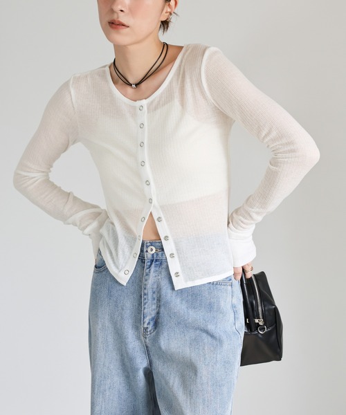 -point- & -styling- 軽やかさと抜け感を楽しむ大人のシアーカーディガン。 伸縮性に優れたテレコ素材は体のラインを拾いすぎず、 程よくフィットし女性らしいきれいなラインを叶えてくれます。 コットン混のソフトタッチな肌触りと伸縮性のある素材が ストレスフリーな快適な着心地。 程よい透け感が上品な肌見せを叶え、軽やかな着心地ともにロングシーズン使用可能〇 シンプルなのでボトムを選ばずテイストレスに活躍するアイテムです。 女性らしい細身のシルエットなのでワイドパンツと合わせた抜け感のあるスタイルがおすすめ。 コットン混リブレイヤード ---------------------------- 素材 ポリエステル65%・綿35% ---------------------------- 伸縮性 ★★★☆☆ 裏地 なし ---------------------------- ※モニター・環境等により実際の商品と多少色味が異なって表示される場合がございます。 予めご了承をお願いいたします。 ======================= ■袋梱包の為、染料による特有の匂いが抜けきれず、匂いがする場合がございますが不良品にはあたりません。 上記注意点での返品、交換はお断りします。ご了承の上お買い求めくださいませ。 ■本製品は生産過程におきまして色味、サイズ感等若干の誤差が出る場合がございます。予めご了承くださいませ。 ======================= 【お買いものをお楽しみいただく為に!】 ▼商品のお気に入り登録 完売カラーの再入荷通知や、ラスト1点の通知、セールの通知も受け取ることができます。 ▼ブランドのお気に入り登録 新商品や再入荷など、いち早くブランドのお得な情報を受け取ることができます!