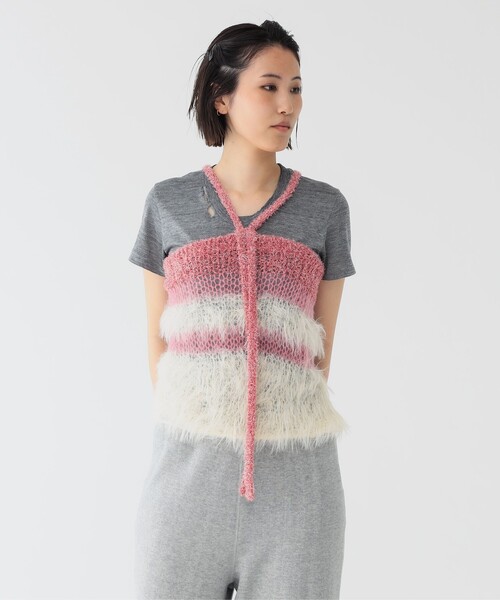 贅沢素材でレイヤードを楽しむ! 贅沢素材でレイヤードを楽しむ! ■デザイン ピンク、グリーンをキーカラーに3種類の糸で丁寧に編み分けた〈maturely(マチュアリー)〉のキャミソール。ラメ糸、シャギー糸、モヘア糸を組み合わせることで、雰囲気を出しつつも遊び心をプラス。シーズンムード満載の他にはないユニークなデザインが魅力的です。 ■コーディネート Tシャツや薄手のニットとの重ね着はもちろん、幅広いアイテムとのレイヤードスタイルが楽しめます。クールな雰囲気から可愛らしい印象まで、様々なテイストにマッチし、スタイリングのアクセントにぴったり。 ■サイズ 程よくゆとりのあるサイズ感で、窮屈感なくレイヤードがお楽しみいただけます。 ■素材 ラメ糸はナイロンベースの軽やかなラメにポリエステルを加えて上品な輝きを、シャギー糸は糸自体のシャリ感ときらめきで華やかさを、モヘアブレンド糸はふんわりとしつつ上品な光沢があるところが特徴。超ローゲージの1.5ゲージの針抜き編みで3種類の糸を巧みに使用しました。 ※編み方の特性上、ご着用により伸びが生じる可能性がございます。保管の際はハンガーにかけず、たたんでいただくことをお勧めいたします。 ■ケア方法 ウェットクリーニングのみ可(詳細は商品についている品質表示ラベルをご覧ください) 生地の厚さ:やや薄手 透け感:あり 伸縮性:あり 光沢感:あり 裏地:なし 【スタッフレビュー】 スタッフ:安藤 奈央 身長:153cm / 普段サイズ:S / 着用サイズ:ONE SIZE 骨格タイプ:ウェーブ サイズ感: 身幅もあるので様々なアイテムにレイヤードできます。 素材感: ふわふわとしたニット素材。 ポイント: キラキラした素材感、前後両用が嬉しい! ※光の当たり具合やパソコンなどの閲覧環境によって、実際の色味と異なって見える場合がございます。予めご了承ください。 ※商品の色味は商品単体で撮影した画像をご参照ください。 maturely / マチュアリー ブランドキーワードは、MODEとTRADITIONALを組み合わせた“MODETRAD(モードトラッド)”。トラディショナルなウエアが持つ背景をモダンに昇華したデザインで、コレクションを展開します。トラッドもモードも好き。好きなファッションは変わらない。ルールに囚われることなく好きな服を着ていたい。maturelyは、スタイルをもった恰好よくもチャーミングな女性のためのブランドです。