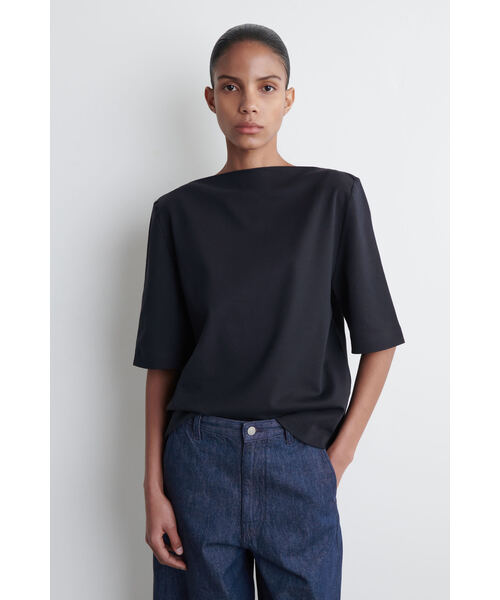 モダンなシルエットと上質な生地は、COSのデザイン言語の柱です。 コットンジャージーを使用したこのネイビーのTシャツは、ボートネック、ゆったりとした半袖、 そしてウエストラインを繊細に引き立てるシェイプシームが特徴です。 ・リラックスフィット、 シェル:綿100%。トリムを除く / 洗濯機洗い可 Sサイズの背面長は57.7cmです。モデルはSサイズを着用しています。