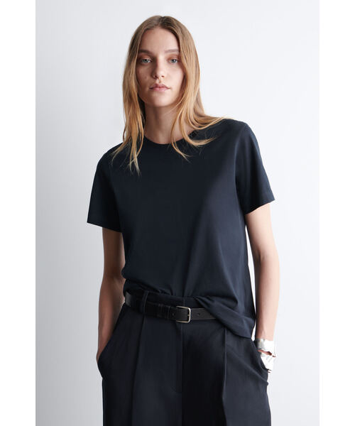 コットンジャージーを使用したこのTシャツは、薄手で軽やかなさらっとした着心地で、デイリー使いにとても活躍してくれます。そこまでフォーマルな雰囲気ではないので、デニムなどのカジュアル合わせはもちろん、スラックスやレザーアイテムなどフォーマルの外しとしてもお使いいただけます。 (レギュラーフィット) 本体:コットン100%(トリムを除く)/洗濯機洗い可 サイズSのバック丈:60.8cm/モデル着用サイズ:S