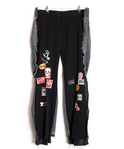 SEVESKIG フロントはドレッシーなスラックス、バックはラフなライトオンスデニム。まったく異なる2つのパンツをドッキングさせた、SEVESKIGらしい遊び心と職人技が詰まったダブルフェイストラウザーズ。ブラックのスラックス側には、70〜90年代のカルチャーを彷彿とさせる刺繍ワッペンプリントを多数配置。 ポップでレトロなグラフィックモチーフが目を引き、アートピースのような一本に仕上がっています。 両サイドにはダメージ加工を施したデニムを大胆に縫い付け、裁ち切りのフリンジが絶妙なユーズド感を演出。 裾にもあえて処理を加えず、ラフなニュアンスをプラス。 一見するとパンチのあるデザインですが、テーパードのきいたシルエットがどこかクリーンな印象も残し、スタイリングの幅を広げてくれる名作ボトムスです。 026 春夏コレクションのテーマは「MEMORIES」。 デザイナー自身が 15 歳、16 歳の頃に体験した記憶を具現化したものです。 子供から大人へと移り変わる多感な時期、変化への恐れと同時に希望に満ち溢れていた心情をデザインやランウェイショーの演出へと落とし込みました。 舞台となるのは 1995 年 -1996 年。スケートボード、ヒップホップ、ミクスチャーロック、ストリートカルチャーが絶頂を迎えたエネルギッシュな時代。 ランウェイショーでは、その熱気とクリエイティブな空気を鮮やかに蘇らせています。 象徴するアイテムがアロハシャツです。 出身地の大分県にある、ガレリア竹町商店街で夜に友達と缶蹴りをした記憶や、自作したランプを使ってスケボーで海に飛び込んだエピソード、仲間たちと別府公園で滑った風景をイラストでプリントしました。 SEVESKIG・・・“ありそうでないもの”をコンセプトとしたレザーを中心としたコレクションはテーラリングに裏付けされたパターンからなる構築的なデザインと、VINTAGEに見られる質感を融合させ一人の職人が全行程を行う“丸縫いレザー”という前代未聞の商品を展開する。 大事なのは MADE IN JAPAN であること。 日本の革職人の確かな技術に、デザイン・加工という遊び心を加える。 将来自分たちが作った服が、買ってくれたお客様の子供、さらにはその孫たちにも着てもらえることが目標。 大手アパレルメーカー経験後、東コレブランド、国内ドメスティックブランドのディレクション兼MDを担当したディレクター。同じく大手アパレルメーカーから国内ドメスティックブランド、フリーランスで数々のブランドのデザインで活躍したデザイナー。大手アパレル在籍、ロンドンのSavile Rowで修行の経験を持つパタンナーの3人がスタートさせる。