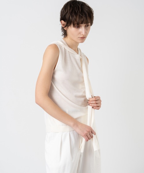 ■リボンデザイン ノースリーブニットトップス 首元にさりげなくあしらったリボンデザインがポイントのノースリーブニットトップス。 柔らかな肌触りの軽やかなサマーウールニット素材で、さらりとした着心地が魅力です。 コンパクトなシルエットながら、スカーフ部分を垂らしたり結んだりすることで印象を変えて楽しめます。 一枚ではもちろん、ジャケットやカーディガンのインナーとしても活躍し、季節の変わり目にも重宝するアイテムです。 透け感[ややあり] 生地の厚さ[超薄手] 光沢感[なし] 伸縮性[あり] 裏地[なし] ポケット[なし] 【ELOOPS】 「ESCAPE FROM THE LOOPS」 モードの流れを取り入れつつ、どこかエッジの効いたデザインを加えた、シンプルでありながら個性を主張できるスタイルを発信します。繰り返しの日常や既成概念から脱出し、新たな可能性を探求するジェンダーレスブランドです。 ◆商品のお気に入り登録(ハートマークをクリック)していただきますと 完売カラーの再入荷通知や、完売間近の通知、セールの通知も受けることができます。 ◆ブランドのお気に入り登録 新商品や再入荷など、いち早くブランドのお得な情報を受け取ることができます。