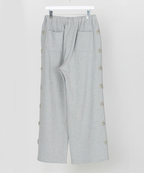 適度な保温性と高い吸水性があるしっかりとした20/10裏毛を使用したスウェット。 サイド部分にランポーニで施したフワラーデザインのスタッズがポイントとインパクト◎となったアイテム。