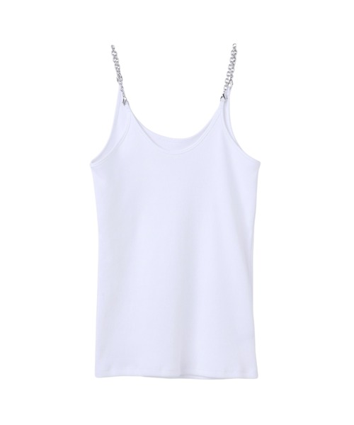 大胆なデコルテのカットラインと、付属のチェーンストラップが特徴的なデザインのキャミソール。別途ゴムストラップも付属しており、着用アレンジが可能。毛羽感が少ない糸を使用し、さらっとした風合いのコットンリブを使用。