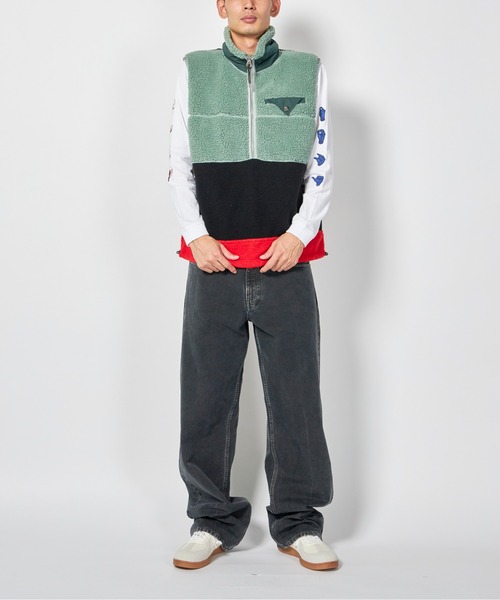 ウールジャージベスト温かみのあるボア素材を使用し、快適な着心地を実現。特徴的な配色とメタルパーツがデザインのアクセントに。裾のドローコードでシルエットの調整も可能な、機能性と個性を兼ね備えた一着です。
