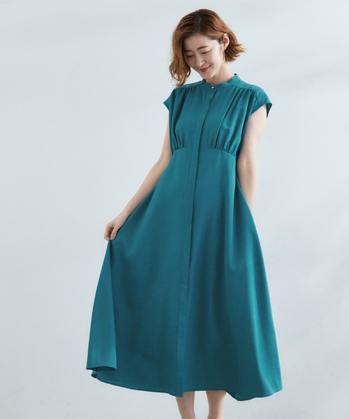 ウエスト高見えでスタイルアップ 1枚で着映える上品シャツワンピース【デザイン】スタンドネックデザインのシャツワンピース。高めのウエスト切り替えで脚長効果があり、自然とスタイルアップが期待できるデザインです。比翼仕立てのすっきりとした前立てに、スタンドネックやフレンチスリーブで上品な印象に。第一ボタンにはさりげないゴールドを効かせてアクセントを加えました。女性らしいフィット&フレアシルエットが魅力の1枚です。【素材】麻のような表情を持ちながら、扱いやすいポリエステル素材を使用。自宅で気軽に洗えるのも嬉しいポイントです。【スタイリング】1枚でさらりと着るだけで清潔感あるスタイルが完成。きれいめなフラットシューズやサンダル合わせで通勤にも、お出かけにもおすすめです。【仕様】・ポケットなし・裏地なし※こちらの商品はやや透け感があるため、インナーの着用をおすすめします。※照明の関係により、実際よりも色味が違って見える場合があります。また、パソコン・スマートフォンなどの環境により、若干製品と画像のカラーが異なる場合もございます。【25AW】モデル情報:身長166cm B80 W59 H86 着用サイズ:02(M)店舗へのお問い合わせ商品番号:768-53016●製品寸法:01(S):着丈116cm B92cm 肩幅51cm W78cm02(M):着丈118cm B95cm 肩幅52cm W81cm03(L):着丈120cm B98cm 肩幅53cm W84cm04(LL):着丈122cm B101cm 肩幅54cm W87cm05(3L):着丈123cm B104cm 肩幅55cm W90cm備考: