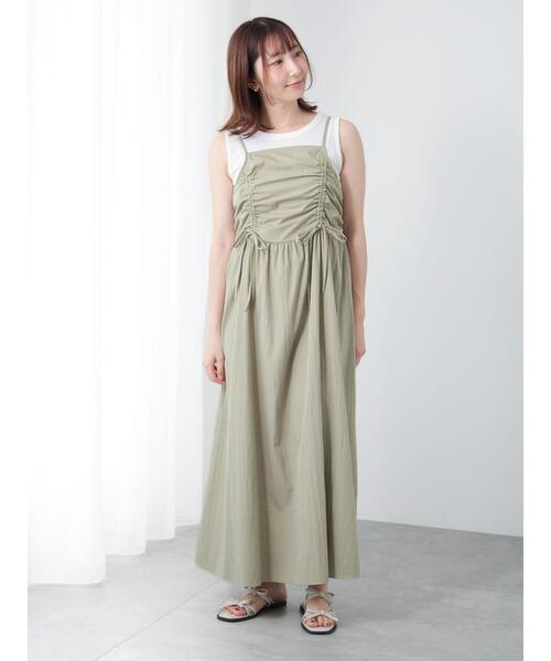 胸元のドロストデザインがアクセントになったキャミワンピース。 くしゅくしゅとしたフォルムとリボンがポイントなった可愛らしいデザイン。 高めの位置で切り替えることにより、脚を長く見せてくれる嬉しい効果も◎ シンプルに着るのはもちろん、インナーをプラスしたりと着こなしの幅も広がるアイテムです。 ※商品画像は、撮影環境やお客様のご利用のPC・スマートフォンのモニター環境などにより実物と色味に差異がある場合がございます。 【その他採寸】 F 身幅:[後ゴム仕様]80cm 着丈:[前]115cm[後]100cm ウエスト:[後ゴム仕様]86cm 全長:[肩ストラップ]41cm