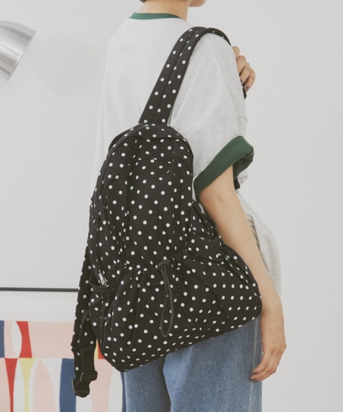 キャッチーなドット柄と、日常使いに嬉しい機能性を兼ね備えたバックパック。■デザイン/素材スタイリングに抜け感とトレンドをプラスするドット柄バックパック。14インチのノートパソコンが入るメイン収納、フロントにはドローストリング付きの立体ポケット、左右には小物収納に便利なサイドポケットを配置。内側にはiPadが入るサイズのポケットも付いおり、抜群の収納力と使いやすさ。肩ひも部分はクッション入りと、長時間の使用でもノンストレスな使い心地で、デイリー使いはもちろん通学や小旅行にもぴったりです。軽やかな素材感と丸みのあるフォルムで、カジュアルにもシティライクにも使える万能アイテムです。■機能ポケットの数:外3個、内1個(iPad収納可能)A4収納:可能ショルダー紐:長さ調節可裏地:なし生地の厚さ:普通※ご注意※・屋外の光や照明の当たり具合で、実際の商品の色味とカラー別画像の色味に若干の違いが発生する場合がございます。・詳細画像と併せてご確認の上、ご注文いただきますようお願い致します。【MERLOT】ジャンルレス、ジェンダーレスをテーマにヴィンテージライクからモダンなアイテムまで幅広く展開。 メンズとレディース、カジュアルとモード。あらゆる境界を取り払うミックススタイルを提案します。【商品のお気に入り登録】完売カラーの再入荷通知やラスト1点の通知、プライスダウンの通知を受け取ることが出来ます。【ブランドのお気に入り登録】新商品や再入荷など、嬉しい情報を受け取る事が出来ます。ぜひご登録ください◎※ご注文いただいた予約商品のお届け時期の確認は、注文履歴ページより行えます。