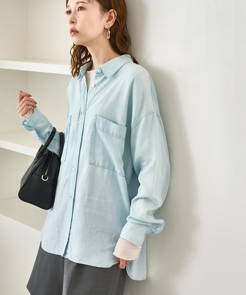 ソフトな風合いと落ち感できれいめに見せる大人のデニム調シャツ。【素材感】・しなやかな風合いのセルロース系再生繊維を使用したシャンブレー素材。・コットン素材とは異なる落ち感と肌触りが特徴のソフトな風合いの素材。【デザイン・シルエット】・羽織やすい着丈のシャンブレー素材のシャツ。・柔らかい素材でカジュアルになりすぎない大人の方にもおすすめのシャツ。・ヒップ周りが隠れる着丈で体型カバーも叶うアイテム。【カラー】・明るめの印象で秋ニットのインナーにもおすすめのサックスとブルー。すでにお持ちの方に2枚めとしておすすめしたいおちついたカラーのチャコールの3色の展開。【スタイリングポイント】・Tシャツやインナーの上に軽く羽織ったスタイルや秋冬はニットのインナーにもきやすいシャツ。ウエストをインにしてベルトでマークした着こなしもおすすめ。-----------------------------裏地:なし光沢感:なし透け感:なし伸縮性:なしポケット:ありボ タン:あり(開閉可)生地の厚さ:普通季節:春、秋、冬(インナーにロンT合わせや、ニットのインに)-----------------------------※撮影時の光、お使いのモニター環境によって色の見え方が違う場合がございます。【モデル着用サイズ】身長:165cm 着用サイズ:38