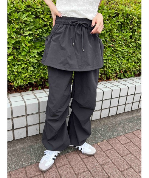 ありそうでなかった!今年らしいレイヤード風なナイロンパンツ シャリっとした生地にカーゴパンツのような ルーズシルエットが抜け感のあるおしゃれを演出! ミニスカートをレイヤードしたようなこなれた印象に。 サイドにギャザー入りで動きのあるラインを作ってくれます。 裾とスカートポケットはドロスト入りで調節可能です。 シンプルなトップスにも、ガーリーなトップスで外しコーデも◎ -------------------------- ポケット:スカート部にあり 裏地:なし -------------------------- ▼便利なお気に入り登録▼商品のお気に入り登録で、再入荷の通知・ラスト1点・お得なセールの通知を受け取ることができます。ブランドのお気に入り登録で、新商品や再入荷など、さらにお得な通知を受け取れます。《Attention》・撮影はサンプル品を使用しており、実際の商品とは仕様や加工・サイズ等が若干異なる場合がございます。・撮影場所や照明の照射・角度、お使いのモニター環境により色味や仕様、加工、カラーが若干異なる場合がございます。・商品によっては1〜3cm程度の採寸誤差がある場合がございます。・移染等防止のため水や汗で濡れたまま放置することは避けて頂き、濃色アイテムは単体でのお洗濯をお願い致します。・素材臭がある場合は陰干しをお願いいたします。・アテンションタグを必ずご確認の上ご使用下さい。