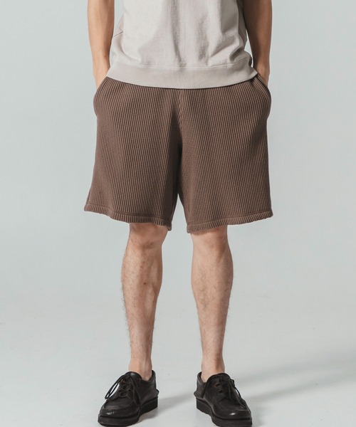 独特のムラ感が特徴的なラフィ綿糸を旧式のジャカード編み機で編み立てた粒立ちが大きいビッグワッフルを使用したショーツです。ビッグワッフルは温かみのある表情でふっくらとした肉厚な素材感ながら耐久性も兼ね備えた素材です。永く愛用していただくためにロール状になったビッグワッフルを放反し一度、リラックスさせてから裁断、縫製。着用と洗濯を繰り返しても歪みや縮みが起こりにくくする工夫と手間を加えています。デザインは1970-80年代の野球選手がワークアウト時に着用していたジムウエアをイメージ。ウエストは軽量で硬めのリブを使用していますのでスエットショーツのような重さがなく、サイドポケットはモノがこぼれ出ないようファスナー付き仕様にしました。