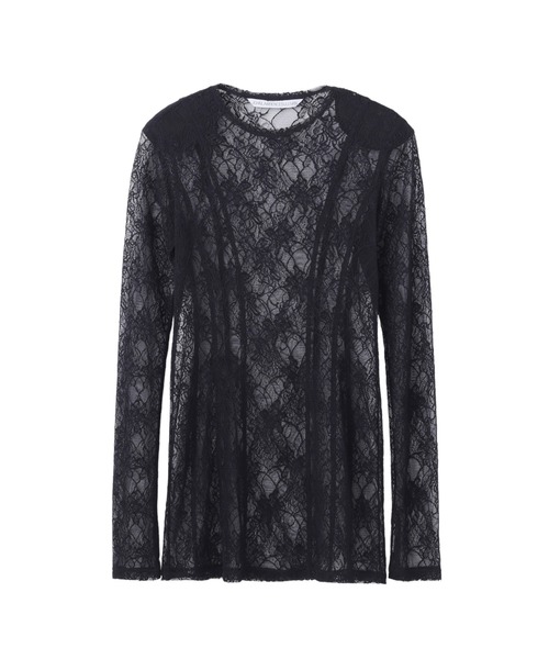 コルセットやランジェリーを連想するカットラインが特徴的な肩パッド付チュニック。ヒップ下丈のIラインシルエット。イタリアErco Pizzi社の繊細でありながらストレッチ性が高い、甘さを抑えた上品な花柄のラッセルレースを使用。