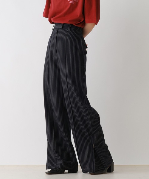 裾のジップでシルエットを自由自在に変えられる優秀スラックス ■おすすめの着こなし ☆ジップを開けたフレアデザインには・・・ 美脚見え間違いなしのフレアシルエットは、Tシャツをインして着るだけでも様になるのが嬉しいポイント。 コンパクトなトップス合わせでスタイルアップするのはもちろん、ルーズなアイテムと合わせても緩くなりすぎずおすすめです。 ☆ZIPを閉じたストレートデザインには・・・ ジップを閉じれば、ベーシックなスラックスに様変わり。 合わせを選ばないのでTシャツはもちろん、ブラウスなど幅広い着こなしが楽しめます。 オフィスカジュアルにもおすすめです。 ーーー ■ポイント ストライプとグレーのベーシックなアイテム。 ベーシックだからこそ、サイドジップがちょっとしたアクセントに。 シンプルに着たい時は、サイドジップを閉じたままにするとストレートパンツに。 サイドジップを開けばフレアパンツにシルエットが変わるので、その日の気分でアレンジが可能。 ウエストはバックゴムになっているので、座ったときに楽なのも◎ センターラインは立体感のあるデザインにすることで、より美脚見えするのもポイントです。 ■素材 シワが付きにくく、きれい見えするTR素材を使用。 上品な質感で高見えしつつ、肌触りも良いのでデイリーユースしていただけます。